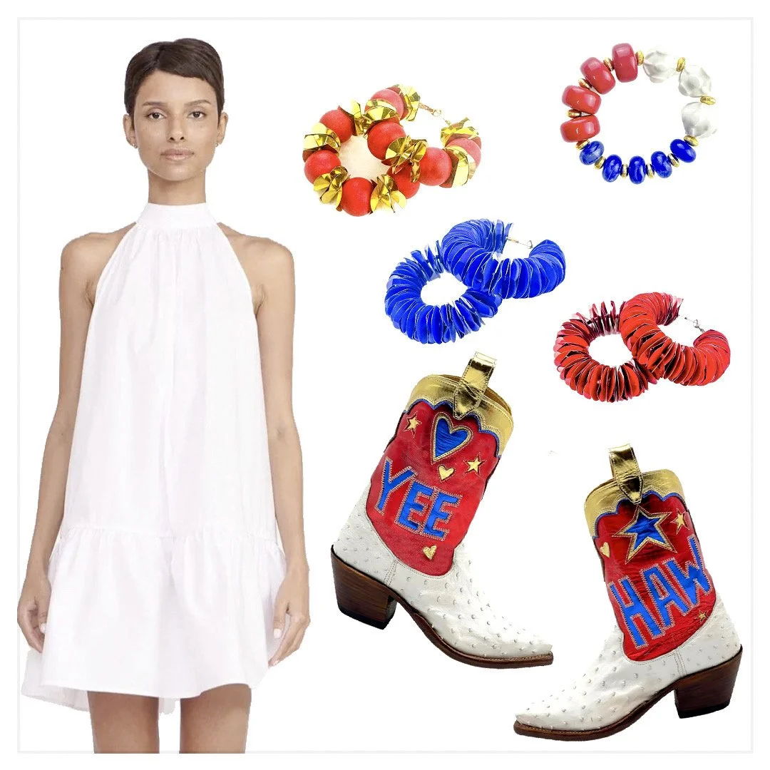 Pop of Color Earrings by rosie + belle, Sparkle and Shine Earrings in Blue Lazersheen by rosie - + belle, Sparkle and Shine Earrings in Red Lazersheen by rosie + belle, bracelet by rosie + belle, boots by Miron Crosby, dress by Staud
