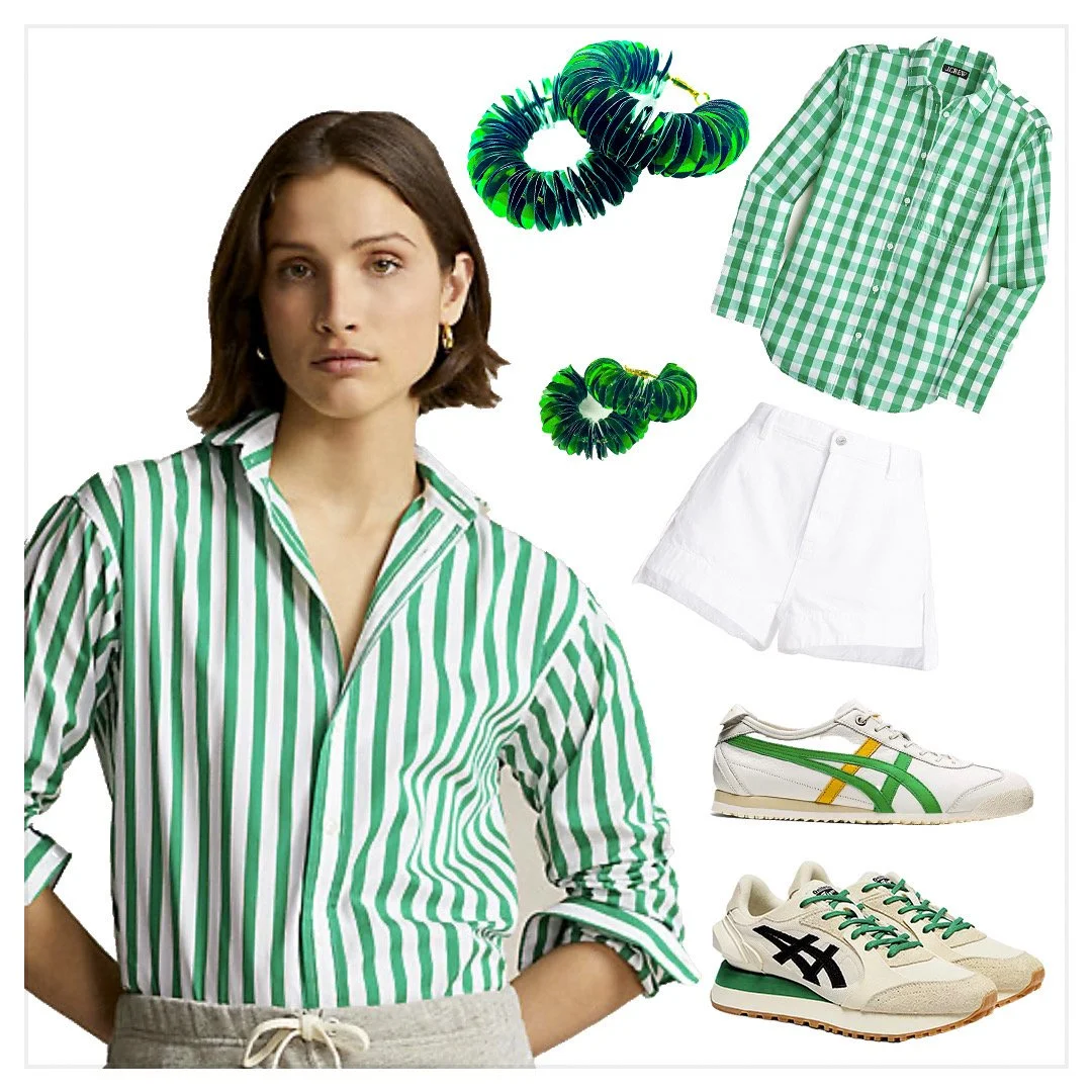 Sparkle and Earrings in green by rosie + belle, Mini Sparkle and Shine Earrings in green by rosie + belle, striped shirt by Polo Ralph Lauren, check green shirt by J. Crew, white tailored relaxed fit shorts by 7 For All Mankind, top shoes by Onitsuka Tiger, bottom shoes by Onitsuka Tiger